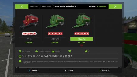 Мод добавляет стандартный прицеп с винтовым конвейером BERGMANN GTW 430 для Farming Simulator 2017 который теперь грузит все стандартные культуры.